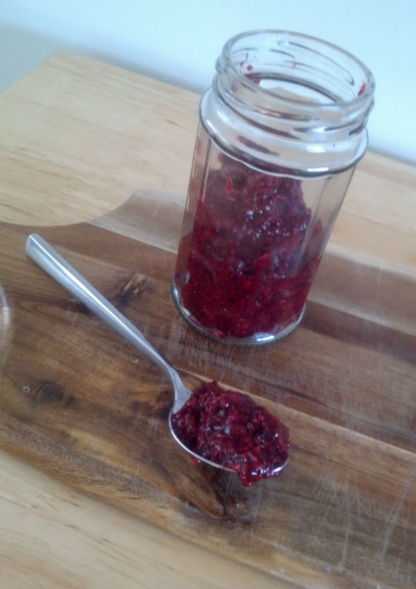 - Mix all ingredients together in a microwave proof dish. Cover with a paper towel and microwave for 3 minutes until the berries “burst”.