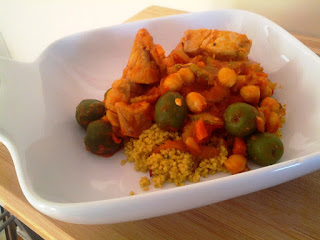 - Add the garlic, tomato paste, spices and cook for 1 minute then add tomatoes, chickpeas, herbs, olives & stock.