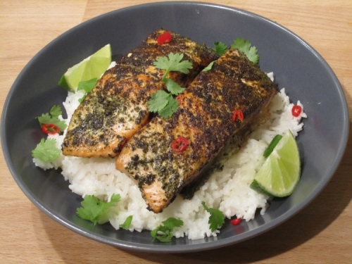 - Fluff up the rice and place on another platter with the salmon chunks on top, sprinkle with the rest of the chilli & coriander and some line wedges. Enjoy!