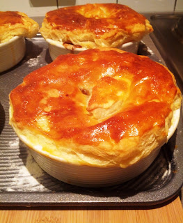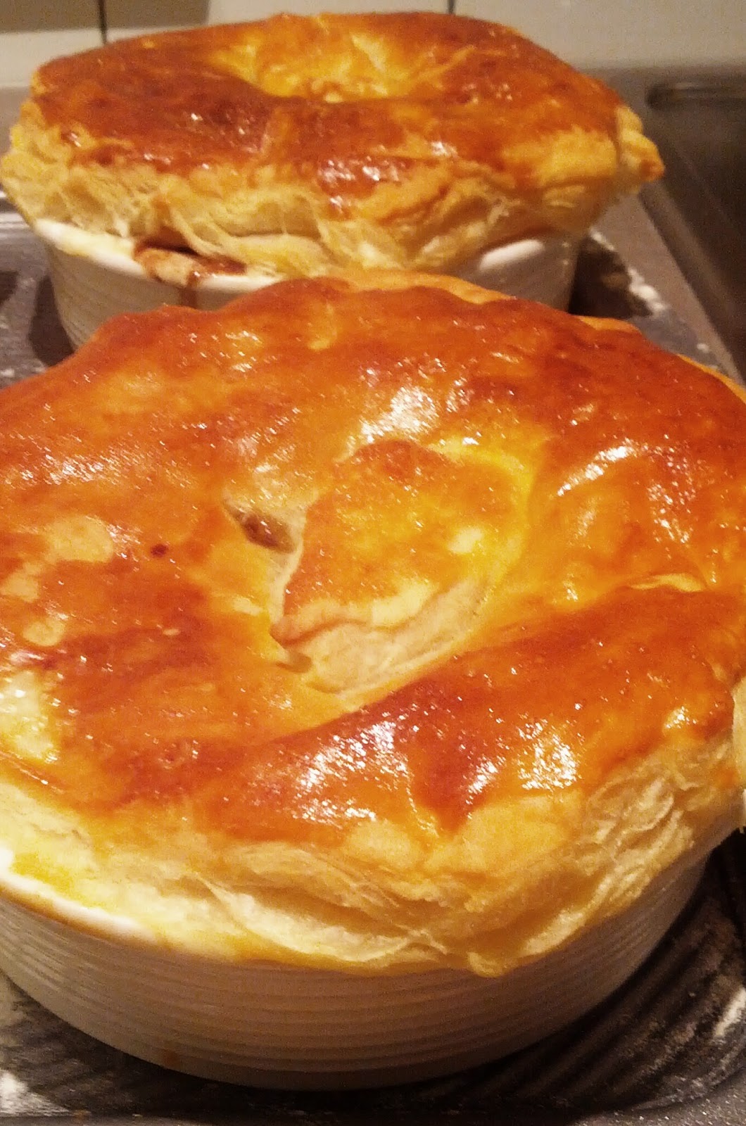 - Fill the pie dishes with the stew, brush edges with the beaten egg. Place the pastry on top and press edges firmly, trim off any excess pastry hanging over the side. Cut a small hole in the centre to allow steam to escape and to prevent the pastry going all soggy.