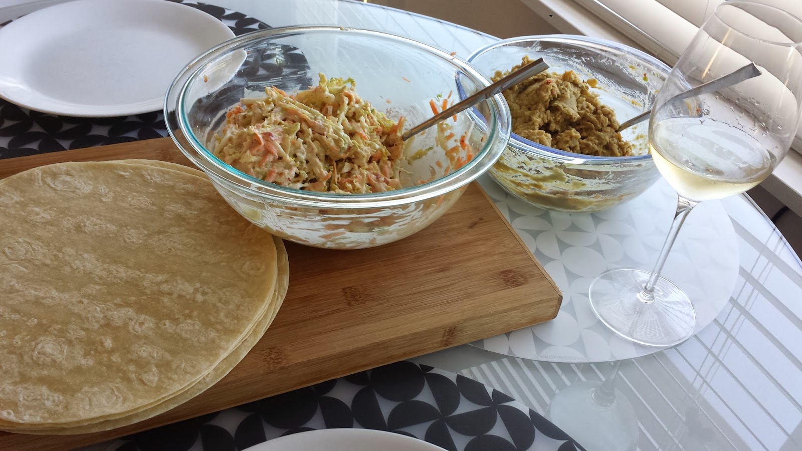 Don't feel like hanging over a hot oven in this weather? Neither did I so a quick yummy wrap was on the menu. Use whatever you have on hand for the filling. I made coleslaw as there were bits and pieces hiding in the back of the fridge. You could use kidney or black beans as well.