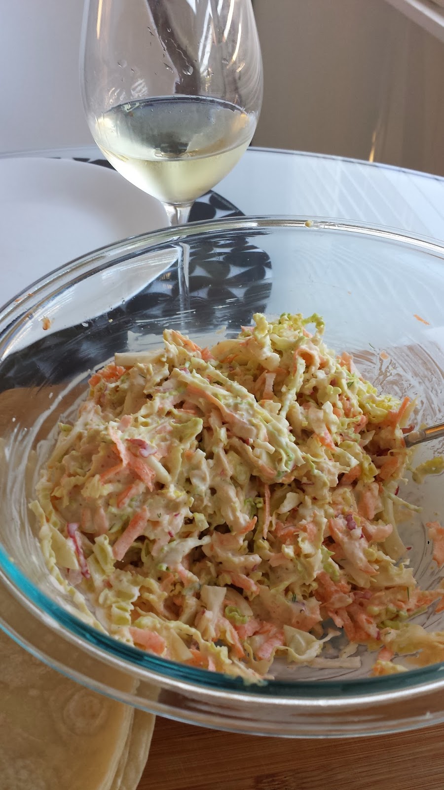 - Finely chop the cabbage and coriander, grate the carrot & apple, slice the fennel, toss to combine with mayonnaise.