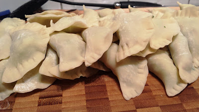 - Put dumpling wrappers on a large board & place a good sized teaspoon of the filling in the centre of the wrapper. Dip your finger in water and moisten the edges of the wrapper, then fold in half. Press around the edges with a fork to seal. Repeat with remaining wrappers and filling.